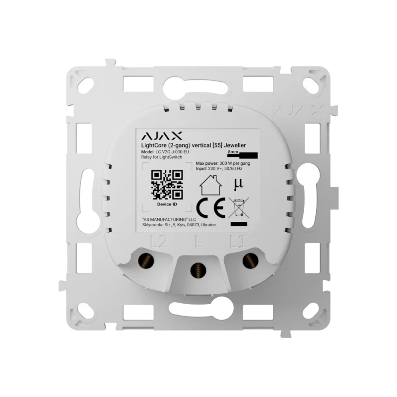 Реле Ajax LightCore (2-gang) vertical для двухклавишного выключателя – это составная часть для умного сенсорного выключателя света LightSwitch. Устанавливается внутри помещений. LightSwitch может заменить любой механический или сенсорный выключатель: в линейке предусмотрены одноклавишные, двухклавишные и проходные выключатели. Устройства можно комбинировать и устанавливать несколько выключателей в одной рамке.