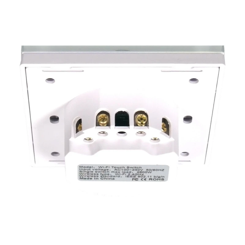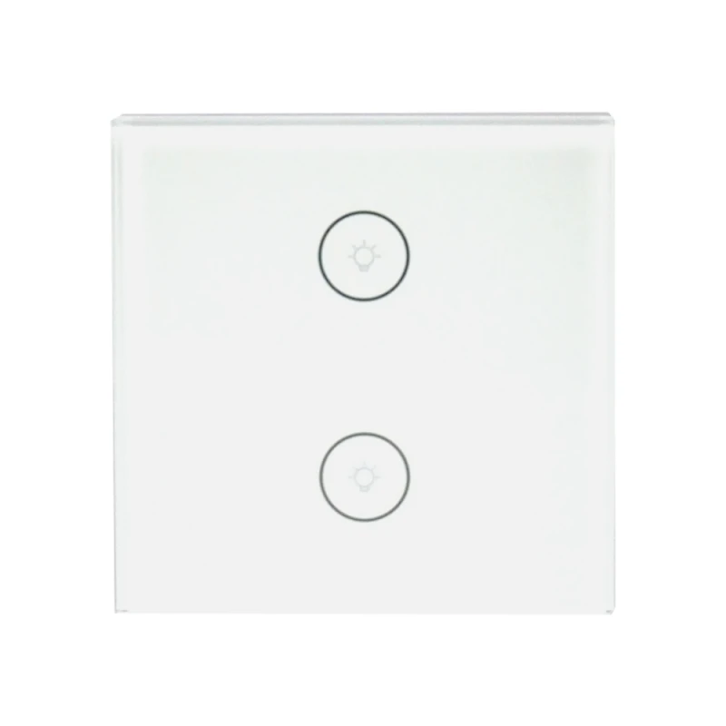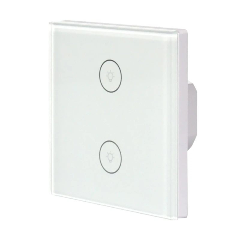 Розумний вимикач світла подвійний сенсорний з підтримкою WiFi 2.4 ГГц (IEEE 802.11b/g/n) та можливістю керування і налаштування через мобільний застосунок Tuya; дальність зв’язку 30 м; номінальна напруга AC 100-240 В, 50/60 Гц; максимальне навантаження на кожен вихід 800 Вт; номінальний струм 10 А; струм споживання у режимі очікування 0.1 мА; голосове керування через Google Assistant / Amazon Alexa; підсвічування кнопок керування; матеріал вогнестійкий пластик; розміри 85 / 85 / 35 мм