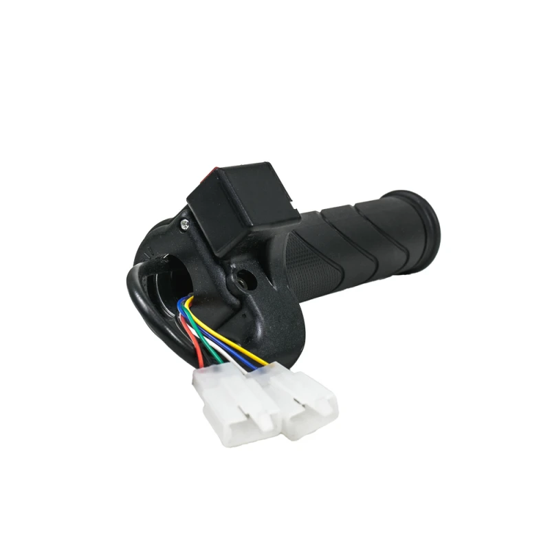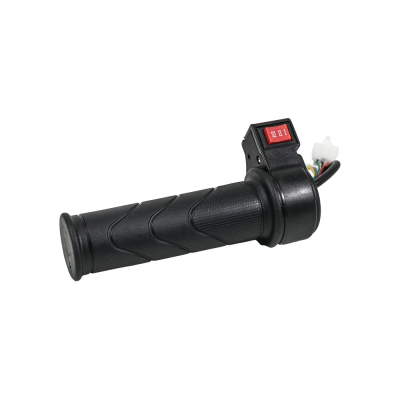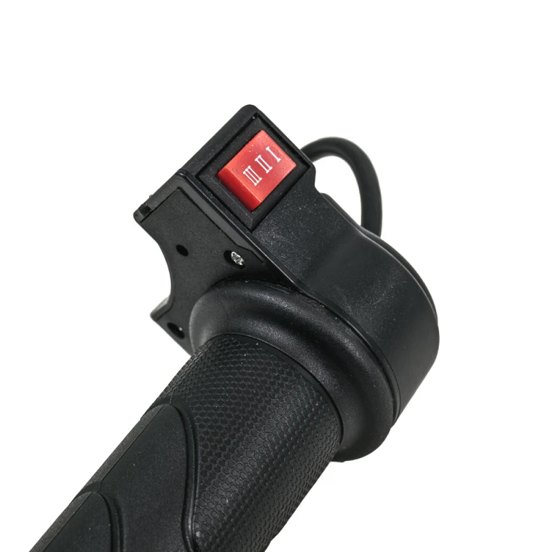 Ручка газу для електроскутерів T408-2/T408-3 призначена для керування швидкістю електротранспорту, сумісна з моделями T408-2 і T408-3. Пристрій виконаний у вигляді правого руків'я з текстурованою накладкою для надійного хвата і вбудованим трипозиційним перемикачем режимів. Підключення здійснюється за допомогою багатожильного кабелю і стандартних роз'ємів, що забезпечують швидке встановлення. Надійний корпус із міцного пластику стійкий до зовнішніх впливів, що особливо важливо під час експлуатації у вуличних умовах. Передбачена можливість плавного прискорення, що підвищує комфорт під час руху.