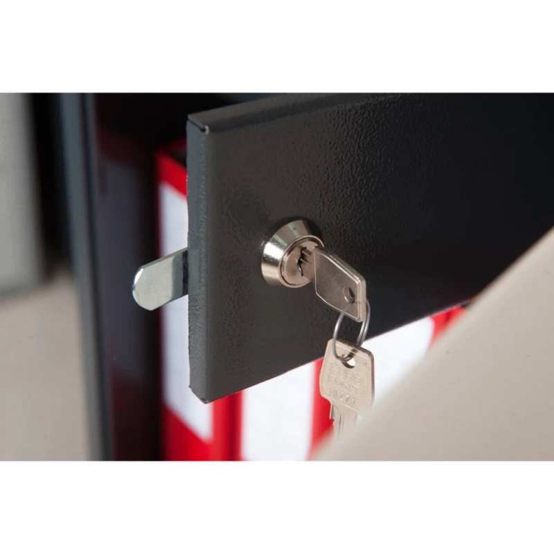 Обладнаний ключовим сувальдним замком. Замикання дверей здійснюється двома хромованими активними ригелями, що обертаються.