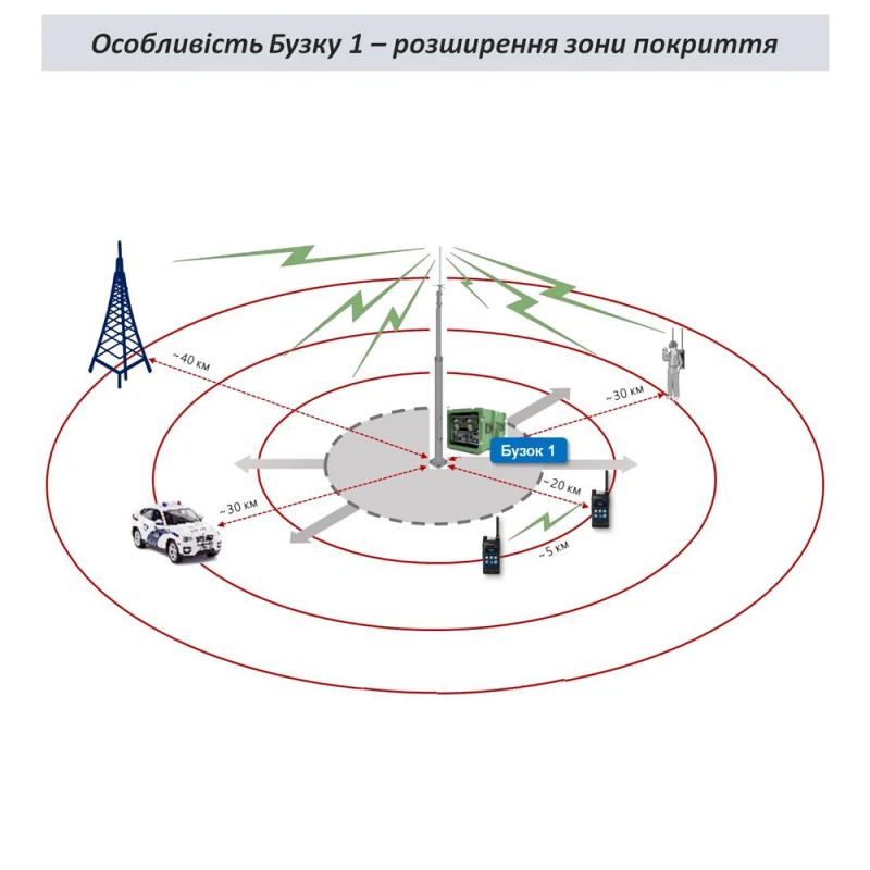 Главная особенность Бузку 1 (бокса радиосвязи) (см. схему на фото) - это расширение зоны покрытия от минимальных 5 км (например, радиус связи между портативными радиостанциями) до 40 км (радиуса покрытия между двумя ретрансляторами).