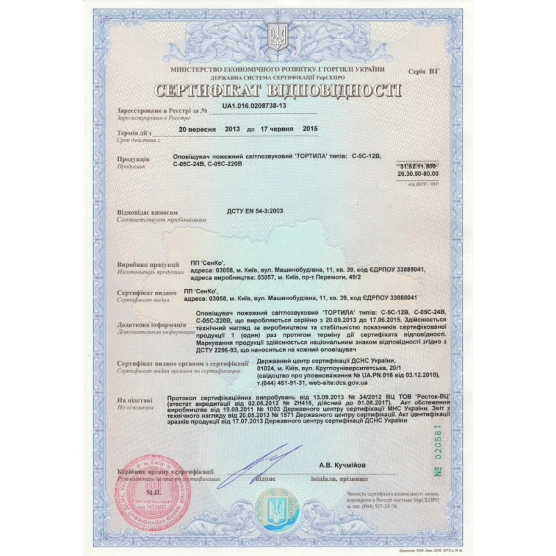 Оповещатель светозвуковой Тортила С-05С-24, питание 24В, акустическая мощность 100дБ, пластиковый корпус. Устанавливается в закрытом помещении. Подключается к охранным и пожарным ППК.
