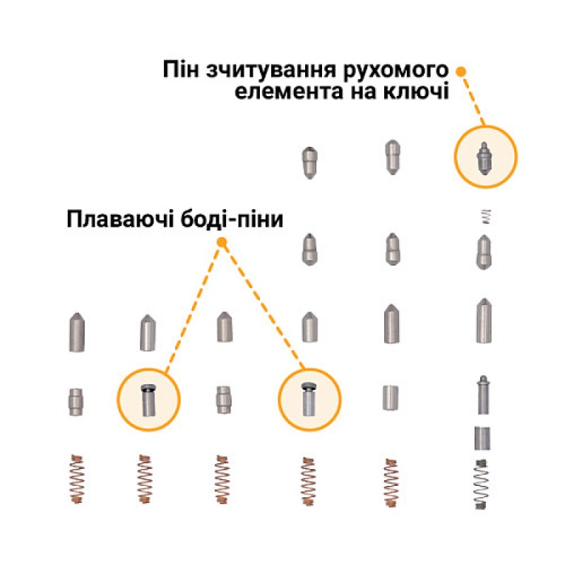 В конструкции 12 пинов: 6 активных – для создания секрета, 5 пассивных – для создания разграничения доступа и 1 – для считывания подвижного элемента на ключе. 2 боковых пина используются для контроля профиля ключа.
