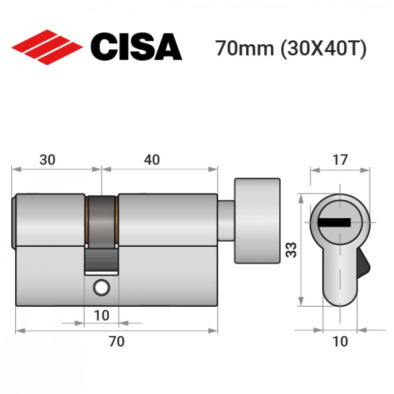 Цилиндр CISA ASIX P8 70T (30*40T) никель матовый 3 ключа