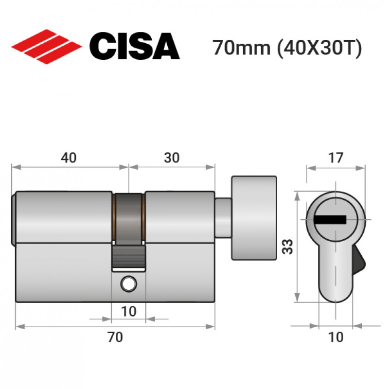 Цилиндр CISA ASIX P8 70T (40*30T) никель матовый 3 ключа