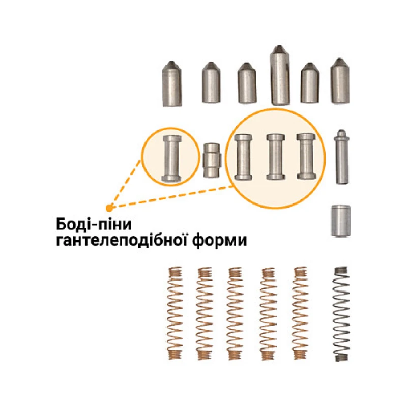 Специальная гантелеобразная форма боди-пинов обеспечивает сложность манипуляций отмычками и открывания цилиндра этим методом.