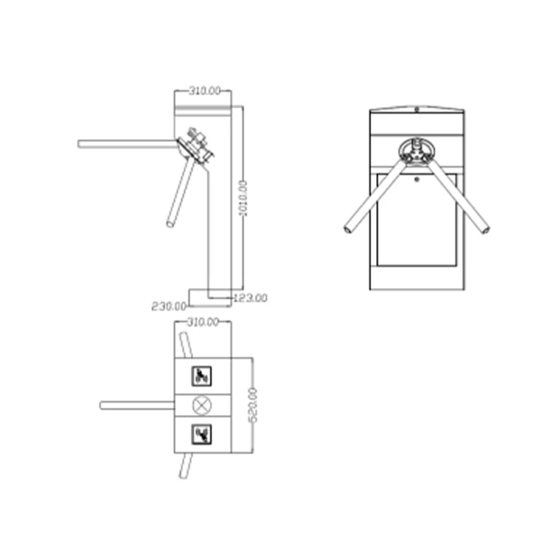 Напівавтоматичний турнікет-трипод; пропускна здатність: 35 чол/хв; ширина проходу: 550 мм; тип конструкції: рожковий; тип встановлення: підлогове; тип турнікета: напівзростовий; живлення: 100-240В; споживання: 24 Вт; час пропуску: 0.2 с; індикатор: світодіодний; встановлення: внутрішнє; матеріал: нержавіюча сталь; розміри: 520 / 310 / 1010 мм