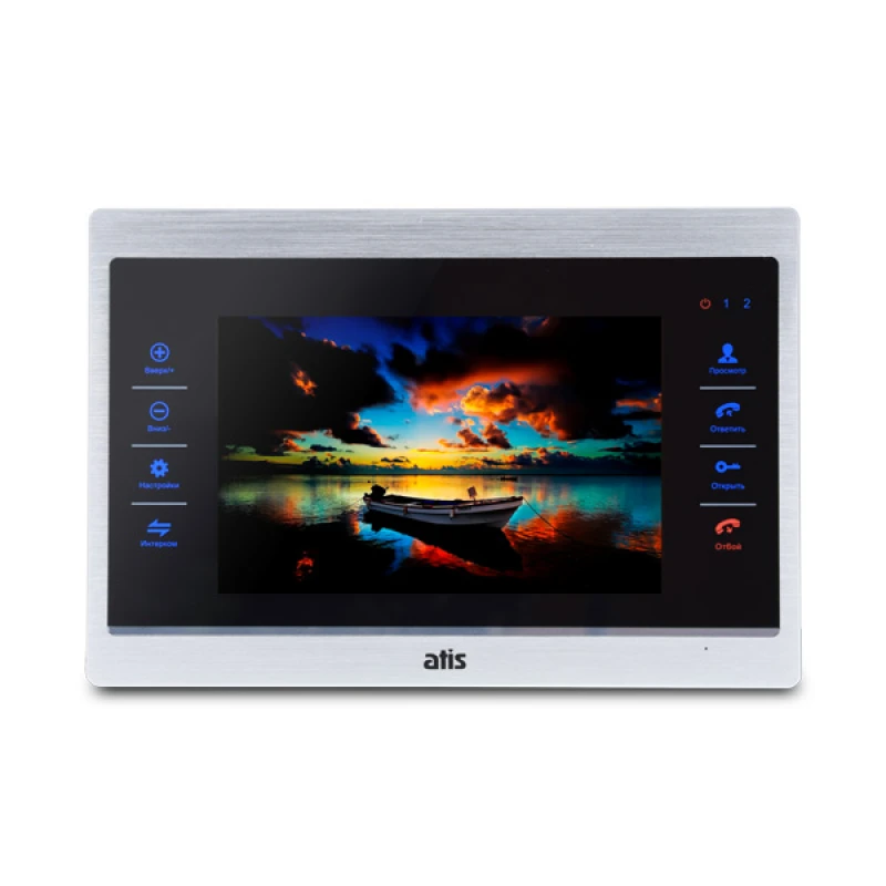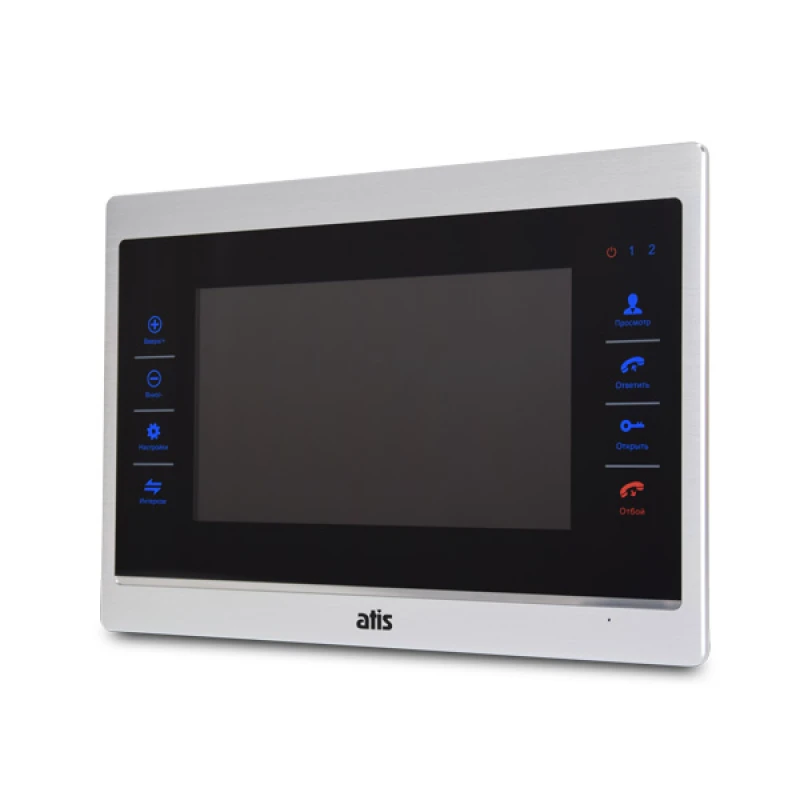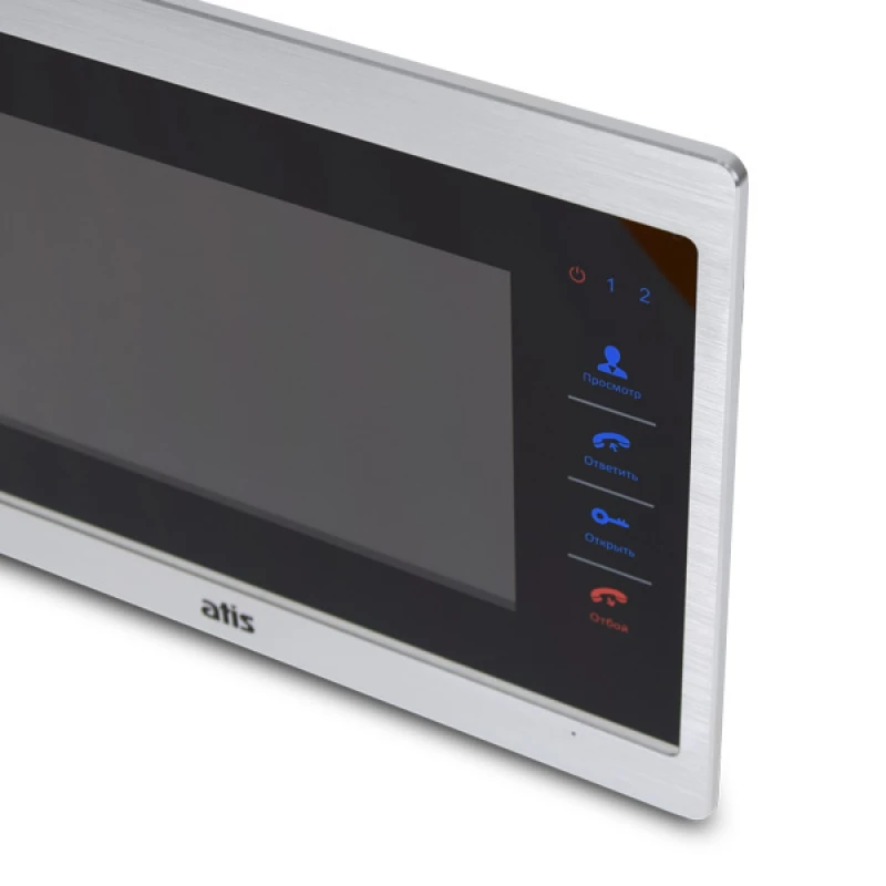 Видеодомофон ATIS AD-740M S-Black с цветным 7 дюймовым TFT-экраном, сенсорными кнопками, возможностью подключения 2 вызывных панелей, 2 аналоговых видеокамер, 2 датчиков тревоги, 3 видеодомофонов и 1 дополнительного монитора (телевизора). Цвет - черный.