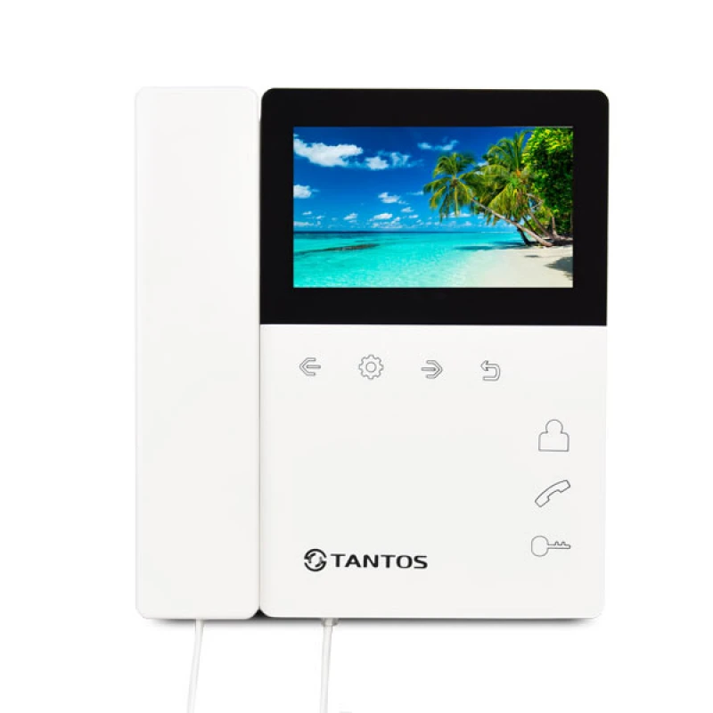 Видеодомофон Tantos Elly с трубкой с цветным 4.3 дюймовым TFT-экраном, сенсорными кнопками управления, возможностью подключения 2 вызывных панелей и 2 аналоговых видеокамер. Цвет - белый.