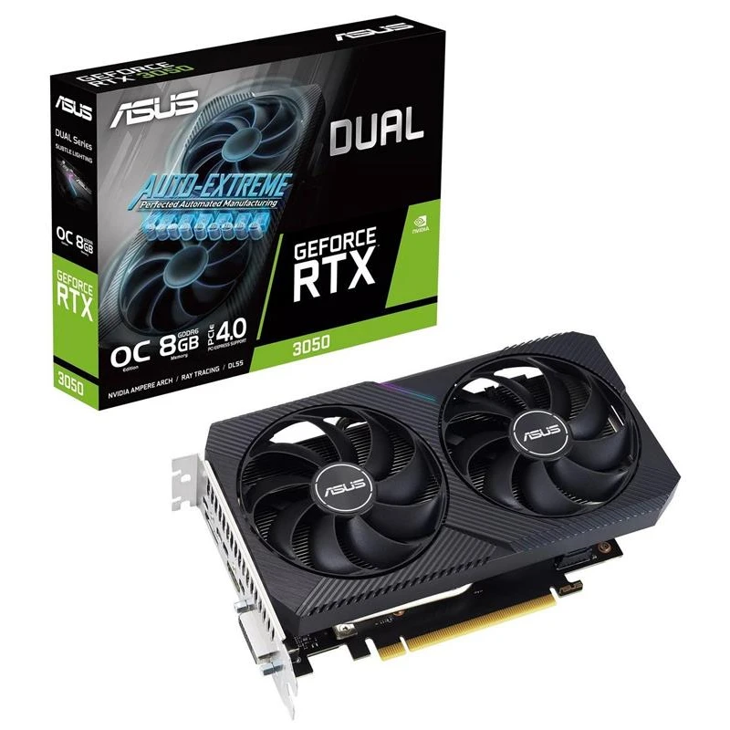 2x вентилятори. 2x Веселощі. Завдяки новітній архітектурі NVIDIA Ampere, ASUS Dual GeForce RTX 3050 V2 поєднує динамічні теплові характеристики з широкою сумісністю. Удосконалені рішення для охолодження від флагманських графічних карт, включаючи два вентилятори Axial-tech для максимального потоку повітря до радіатора, упаковані в двослотову карту довжиною 20 см, що забезпечує більшу потужність при меншому обсязі. Ці удосконалення роблять ASUS Dual ідеальним вибором для геймерів, яким потрібна потужна графічна продуктивність компактного корпусу.