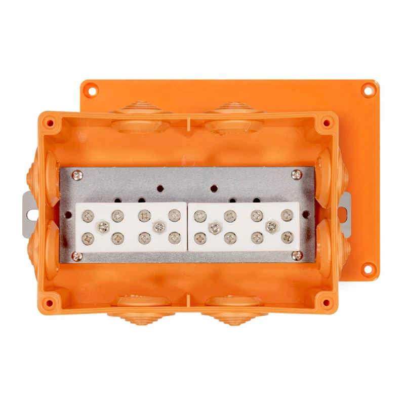 - Вогнестійка коробка має 8 керамічних клем діаметром 6 мм, 8 кабельних вводів.