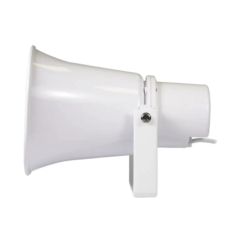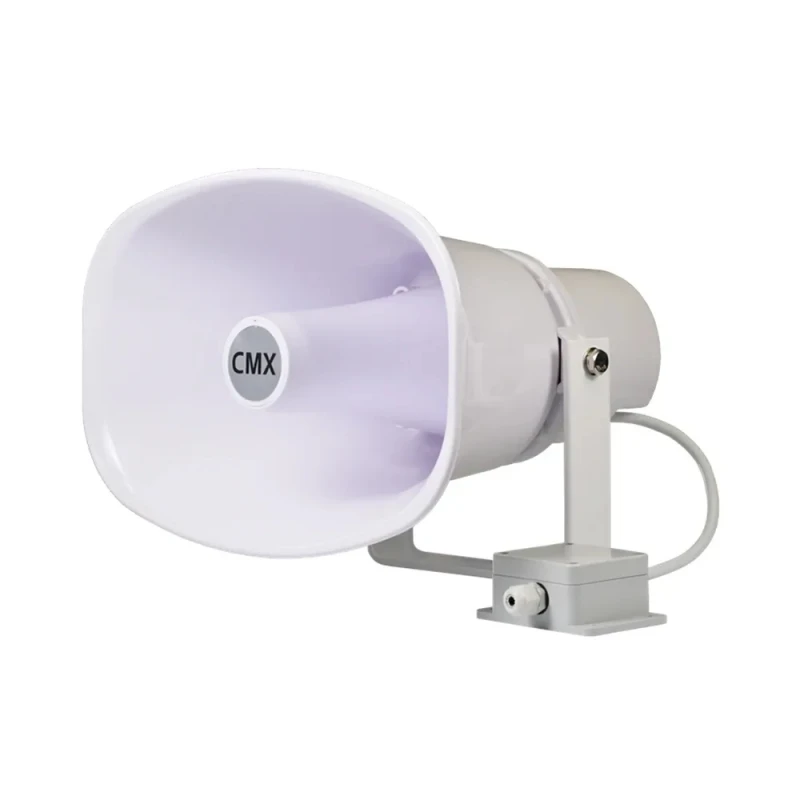 Вуличний настінний гучномовець HSK-15TEN (EN54-24) CMX. Рупорний гучномовець для вуличного встановлення з трансформатором, призначений для голосового оповіщення та системи евакуації. Широко застосовуються при озвучуванні відкритих майданчиків, виробничих та складських приміщень у складі систем оповіщення всіх типів. Гучномовець сертифікований за стандартом EN54-24, звіт про випробування CNBOP 1438-CPR-0840. Розподільча коробка з керамічним роз'ємом, вогнестійким кабелем 95 ℃ і термозапобіжником. Корпус з пластику ABS, кронштейн з алюмінію білого кольору (в комплекті).