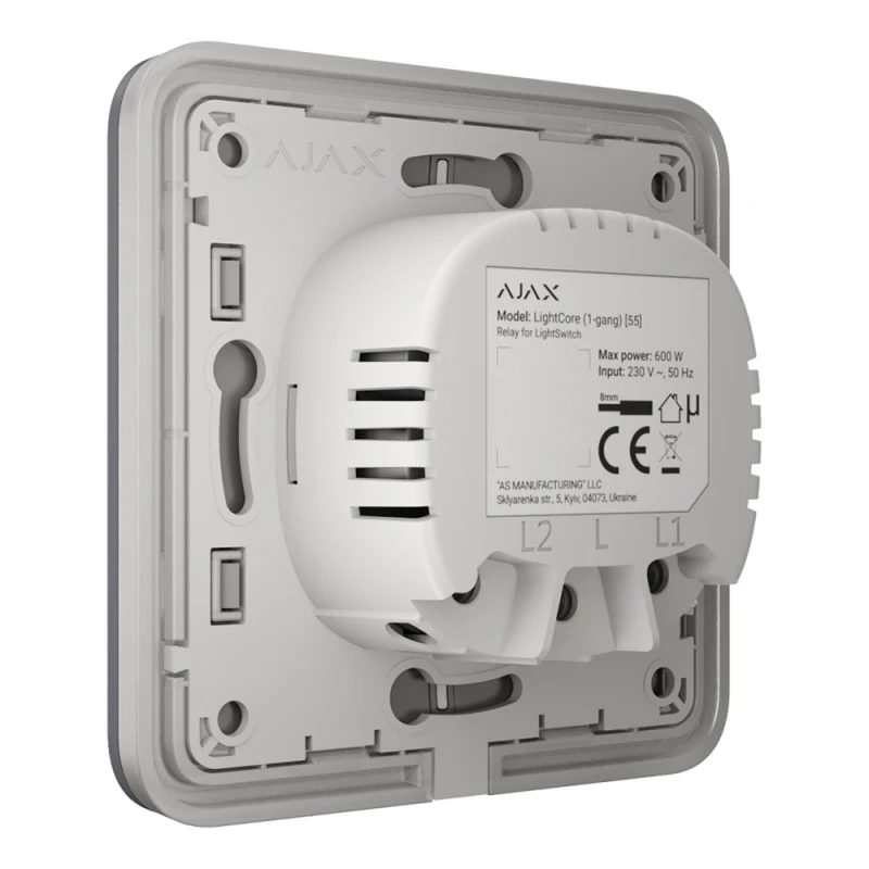 LightSwitch оснащён подсветкой, которая выделяет выключатель в темноте. Подсветка не яркая, поэтому не будет мешать пользователям, даже если выключатель установлен в спальне возле кровати. При необходимости подсветку можно отключить в приложении Ajax.