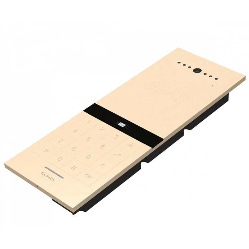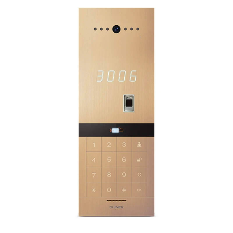 Многоабонентская вызывная IP-панель Slinex Sitara Bio (gold) с камерой 5 Мп, встроенным биометрическим считывателем и считывателем proximity карт Mifare. Цвет корпуса видеопанели - золото.