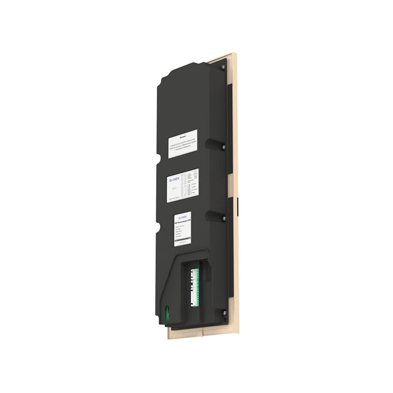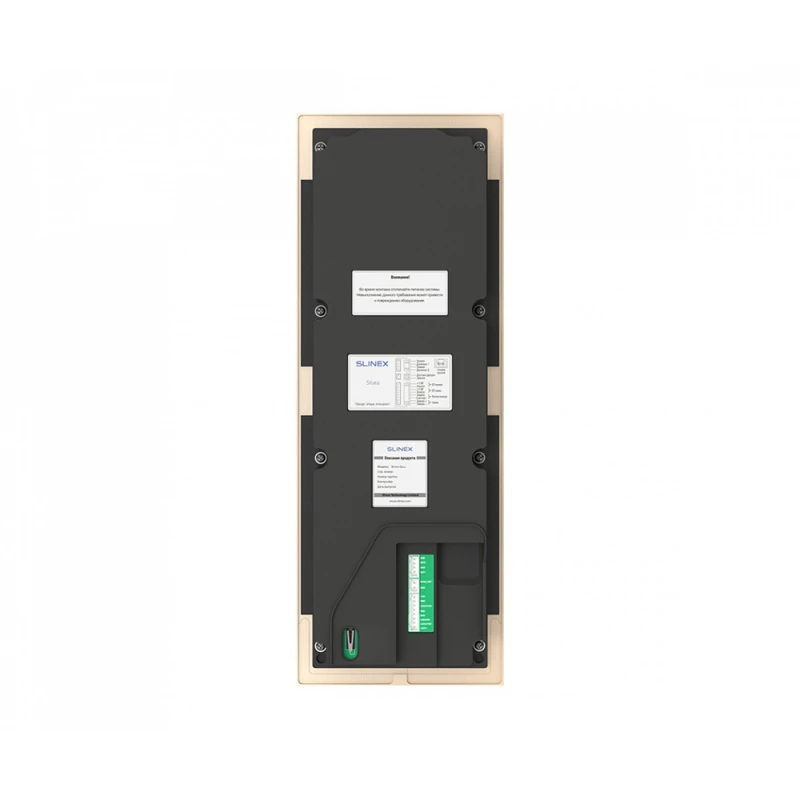 Антивандальный корпус видеопанели Slinex Sitara Bio (gold) выполнен из алюминия. Класс защиты IP65 (система классификации степени защиты оболочки электрооборудования), что означает надежную защиту внутренних компонентов от попадания пыли и влаги (RH95% Max), а также устойчивость к перепадам температур (-40°C ~ +65°C).