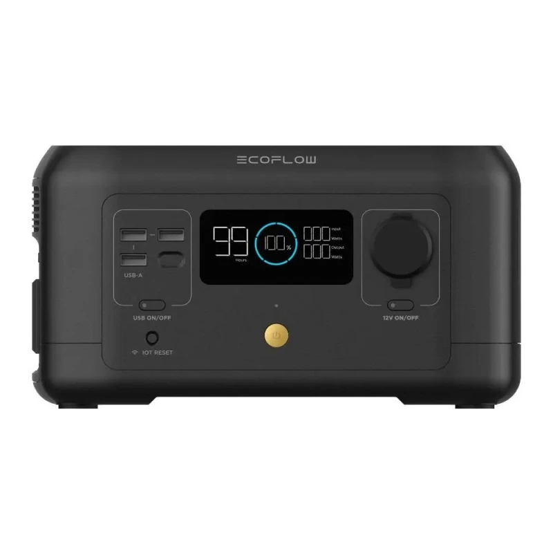 - На LED-панели River mini есть возможность следить за информацией о том, на сколько хватит заряда, какая выходная мощность на каждое зарядное устройство или с какой скоростью происходит зарядка. Используя приложение от компании EcoFlow, можно управлять устройством дистанционно и включать или выключать порты зарядки по выбору.