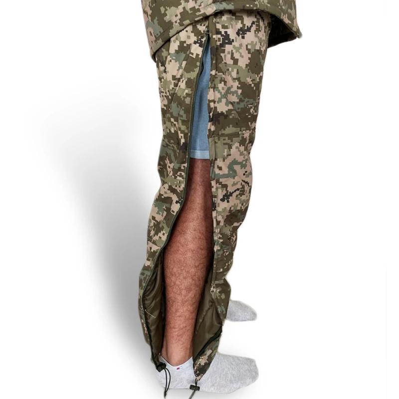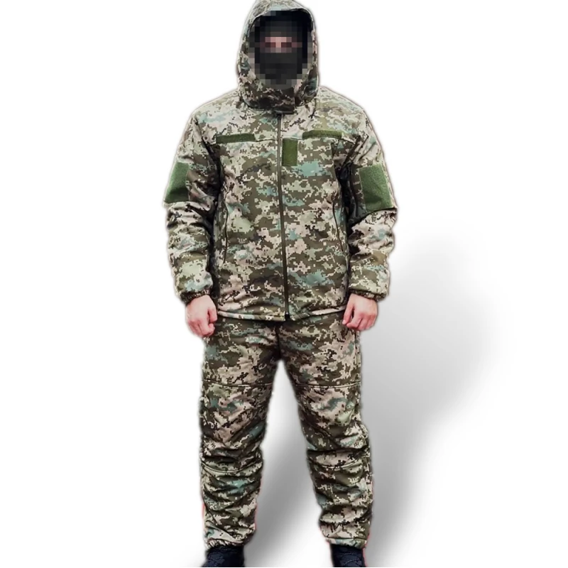 Зимова форма двійка в кольорі ММ14 піксель з мембранного матеріалу Coфтшелл волого- та вітронепроникна, костюм складається з двох частин куртка на блискавці та штани з підтяжками. Високоякісні матеріали та фурнітура, підкладка синтепон 240 дозволяє носити костюм при екстремально низькій температурі з комфортом.
