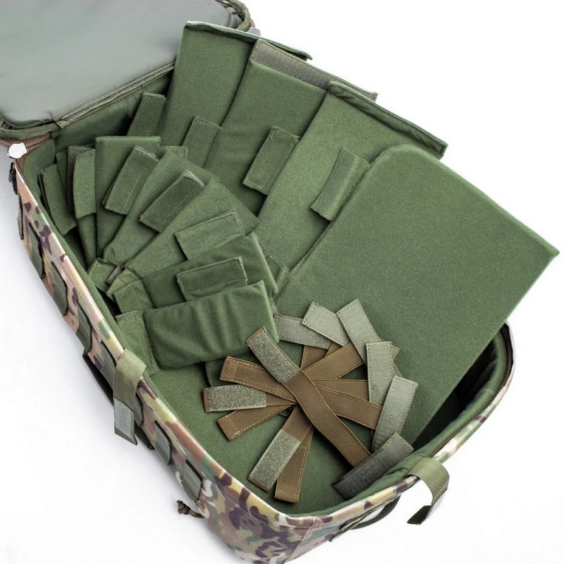 Система MOLLE: З усіх боків та зовнішньої сторони розташовані модульні кріплення MOLLE та MOLLE на Velcro липучці для підсумків або додаткового спорядження. Можна розмістити обладнання на зовнішній стороні рюкзака, а з боків – антени та дроти.